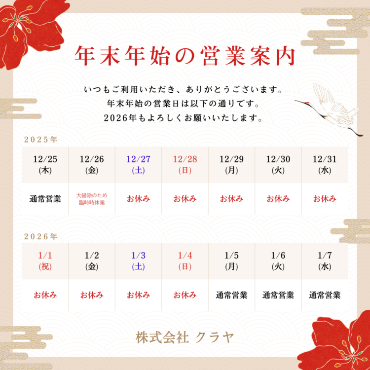 誠に勝手ではございますが、年末年始を下記のとおり休業いたします。